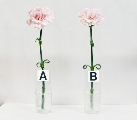 まず、同じようなカーネーションを1本ずつ、同じ量の水を入れた花瓶に挿し、 A、Bとします。